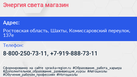 Энергия света, магазин по адресу Ростовская область, Шахты, Комиссаровский переулок, 137е в дальнейшем Организация, размещена в следующих категориях: