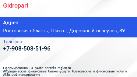 Gidropart по адресу Ростовская область, Шахты, Дорожный переулок, 89 в дальнейшем Организация, размещена в следующих категориях: