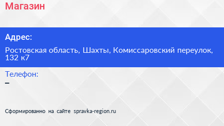 Магазин по адресу Ростовская область, Шахты, Комиссаровский переулок, 132 к7 в дальнейшем Организация, размещена в следующих категориях: