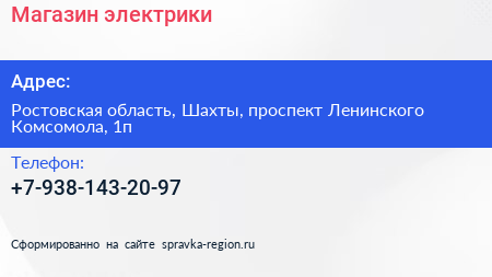 Магазин электрики по адресу Ростовская область, Шахты, проспект Ленинского Комсомола, 1п в дальнейшем Организация, размещена в следующих категориях: