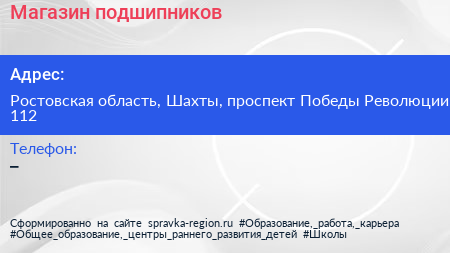 Магазин подшипников по адресу Ростовская область, Шахты, проспект Победы Революции, 112 в дальнейшем Организация, размещена в следующих категориях: