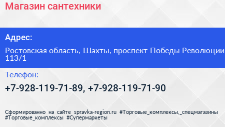 Магазин сантехники по адресу Ростовская область, Шахты, проспект Победы Революции, 113/1 в дальнейшем Организация, размещена в следующих категориях: