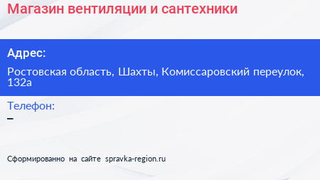 Магазин вентиляции и сантехники по адресу Ростовская область, Шахты, Комиссаровский переулок, 132а в дальнейшем Организация, размещена в следующих категориях: