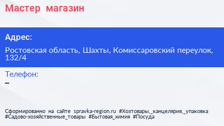 Мастер+, магазин по адресу Ростовская область, Шахты, Комиссаровский переулок, 132/4 в дальнейшем Организация, размещена в следующих категориях: