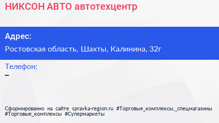 НИКСОН-АВТО, автотехцентр по адресу Ростовская область, Шахты, Калинина, 32г в дальнейшем Организация, размещена в следующих категориях: