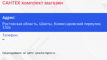 САНТЕХ комплект, магазин по адресу Ростовская область, Шахты, Комиссаровский переулок, 132а в дальнейшем Организация, размещена в следующих категориях: