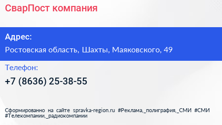СварПост, компания по адресу Ростовская область, Шахты, Маяковского, 49 в дальнейшем Организация, размещена в следующих категориях: