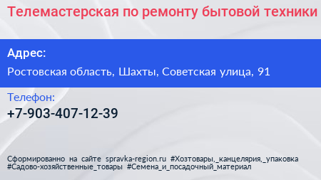 Телемастерская по ремонту бытовой техники по адресу Ростовская область, Шахты, Советская улица, 91 в дальнейшем Организация, размещена в следующих категориях: