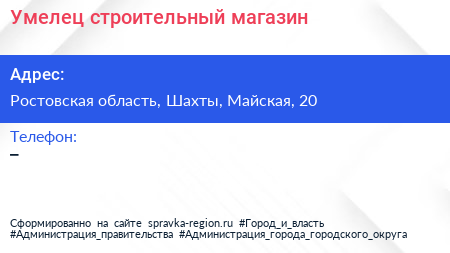 Умелец, строительный магазин по адресу Ростовская область, Шахты, Майская, 20 в дальнейшем Организация, размещена в следующих категориях: