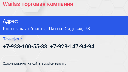 Wailas, торговая компания по адресу Ростовская область, Шахты, Садовая, 73 в дальнейшем Организация, размещена в следующих категориях: