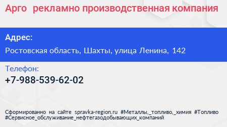 Арго+, рекламно-производственная компания по адресу Ростовская область, Шахты, улица Ленина, 142 в дальнейшем Организация, размещена в следующих категориях: