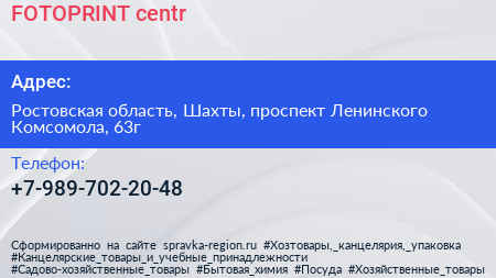 FOTOPRINT centr по адресу Ростовская область, Шахты, проспект Ленинского Комсомола, 63г в дальнейшем Организация, размещена в следующих категориях: