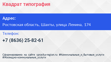 Квадрат, типография по адресу Ростовская область, Шахты, улица Ленина, 174 в дальнейшем Организация, размещена в следующих категориях: