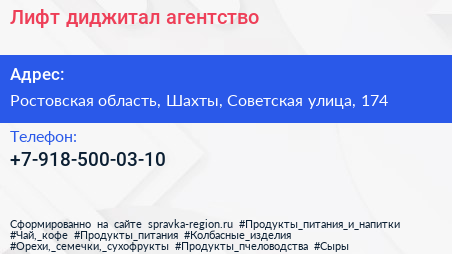 Лифт, диджитал-агентство по адресу Ростовская область, Шахты, Советская улица, 174 в дальнейшем Организация, размещена в следующих категориях: