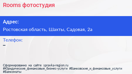 Rooms, фотостудия по адресу Ростовская область, Шахты, Садовая, 2а в дальнейшем Организация, размещена в следующих категориях: