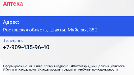 Аптека по адресу Ростовская область, Шахты, Майская, 35Б в дальнейшем Организация, размещена в следующих категориях: