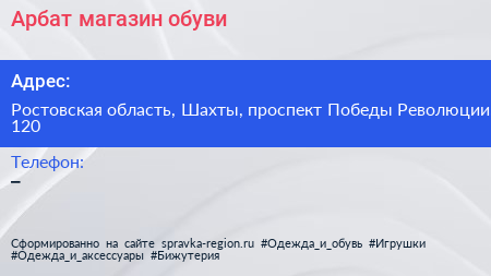 Арбат, магазин обуви по адресу Ростовская область, Шахты, проспект Победы Революции, 120 в дальнейшем Организация, размещена в следующих категориях: