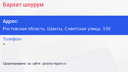 Бархат, шоурум по адресу Ростовская область, Шахты, Советская улица, 150 в дальнейшем Организация, размещена в следующих категориях: