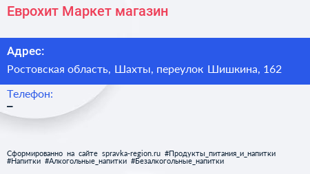 Еврохит Маркет, магазин по адресу Ростовская область, Шахты, переулок Шишкина, 162 в дальнейшем Организация, размещена в следующих категориях:
