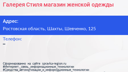 Галерея Стиля, магазин женской одежды по адресу Ростовская область, Шахты, Шевченко, 125 в дальнейшем Организация, размещена в следующих категориях: