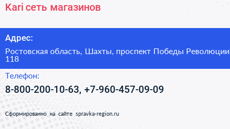 Kari, сеть магазинов по адресу Ростовская область, Шахты, проспект Победы Революции, 118 в дальнейшем Организация, размещена в следующих категориях: