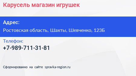 Карусель, магазин игрушек по адресу Ростовская область, Шахты, Шевченко, 123Б в дальнейшем Организация, размещена в следующих категориях: