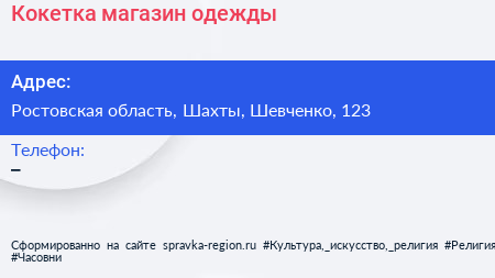 Кокетка, магазин одежды по адресу Ростовская область, Шахты, Шевченко, 123 в дальнейшем Организация, размещена в следующих категориях:
