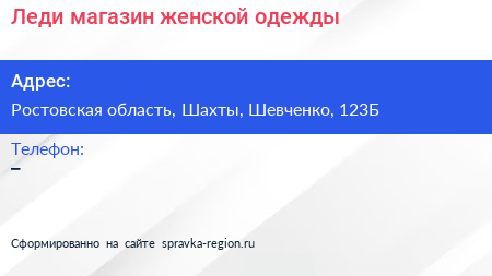 Леди, магазин женской одежды по адресу Ростовская область, Шахты, Шевченко, 123Б в дальнейшем Организация, размещена в следующих категориях:
