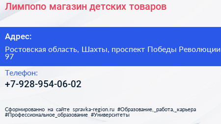 Лимпопо, магазин детских товаров по адресу Ростовская область, Шахты, проспект Победы Революции, 97 в дальнейшем Организация, размещена в следующих категориях: