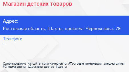 Магазин детских товаров по адресу Ростовская область, Шахты, проспект Чернокозова, 78 в дальнейшем Организация, размещена в следующих категориях: