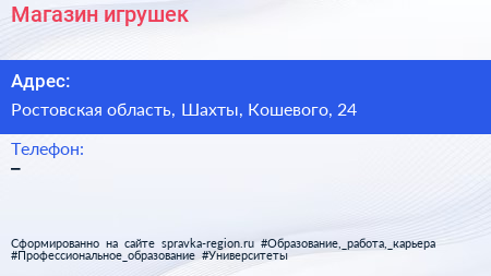 Магазин игрушек по адресу Ростовская область, Шахты, Кошевого, 24 в дальнейшем Организация, размещена в следующих категориях: