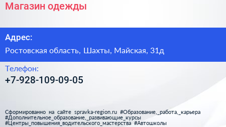 Магазин одежды по адресу Ростовская область, Шахты, Майская, 31д в дальнейшем Организация, размещена в следующих категориях: