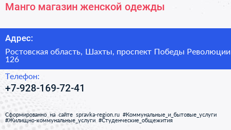Манго, магазин женской одежды по адресу Ростовская область, Шахты, проспект Победы Революции, 126 в дальнейшем Организация, размещена в следующих категориях: