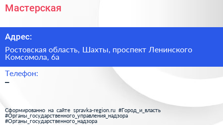 Мастерская по адресу Ростовская область, Шахты, проспект Ленинского Комсомола, 6а в дальнейшем Организация, размещена в следующих категориях: