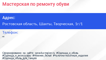 Мастерская по ремонту обуви по адресу Ростовская область, Шахты, Творческая, 1г/1 в дальнейшем Организация, размещена в следующих категориях: