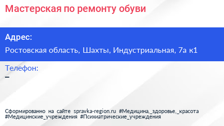 Мастерская по ремонту обуви по адресу Ростовская область, Шахты, Индустриальная, 7а к1 в дальнейшем Организация, размещена в следующих категориях: