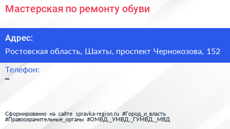 Мастерская по ремонту обуви по адресу Ростовская область, Шахты, проспект Чернокозова, 152 в дальнейшем Организация, размещена в следующих категориях: