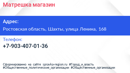 Матрешка, магазин по адресу Ростовская область, Шахты, улица Ленина, 168 в дальнейшем Организация, размещена в следующих категориях:
