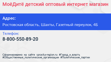 МоёДитё, детский оптовый интернет-магазин по адресу Ростовская область, Шахты, Газетный переулок, 4Б в дальнейшем Организация, размещена в следующих категориях: