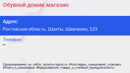 Обувной домик, магазин по адресу Ростовская область, Шахты, Шевченко, 123 в дальнейшем Организация, размещена в следующих категориях: