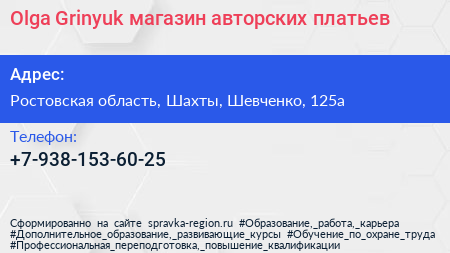 Olga Grinyuk, магазин авторских платьев по адресу Ростовская область, Шахты, Шевченко, 125а в дальнейшем Организация, размещена в следующих категориях: