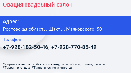 Овация, свадебный салон по адресу Ростовская область, Шахты, Маяковского, 50 в дальнейшем Организация, размещена в следующих категориях: