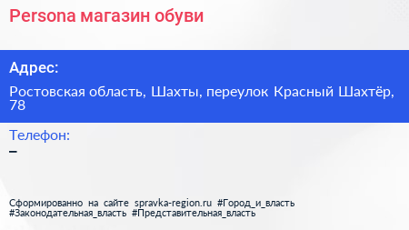 Persona, магазин обуви по адресу Ростовская область, Шахты, переулок Красный Шахтёр, 78 в дальнейшем Организация, размещена в следующих категориях: