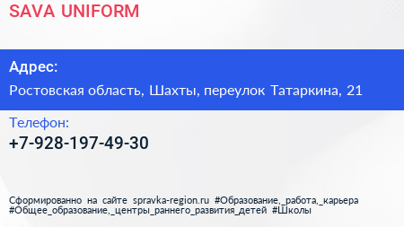 SAVA-UNIFORM по адресу Ростовская область, Шахты, переулок Татаркина, 21 в дальнейшем Организация, размещена в следующих категориях: