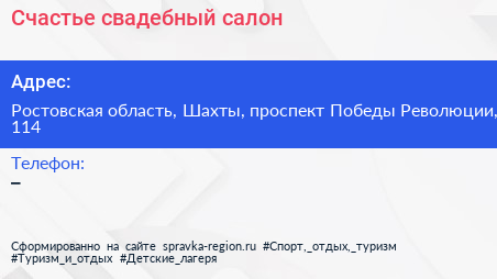 Счастье, свадебный салон по адресу Ростовская область, Шахты, проспект Победы Революции, 114 в дальнейшем Организация, размещена в следующих категориях: