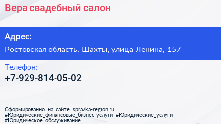 Вера, свадебный салон по адресу Ростовская область, Шахты, улица Ленина, 157 в дальнейшем Организация, размещена в следующих категориях: