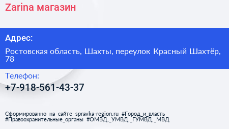 Zarina, магазин по адресу Ростовская область, Шахты, переулок Красный Шахтёр, 78 в дальнейшем Организация, размещена в следующих категориях: