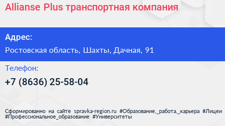 Allianse Plus, транспортная компания по адресу Ростовская область, Шахты, Дачная, 91 в дальнейшем Организация, размещена в следующих категориях: