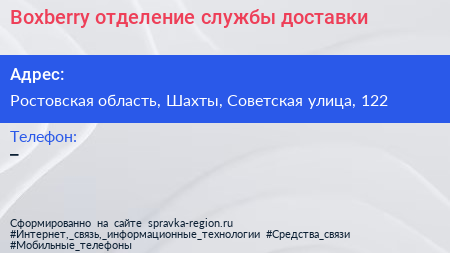 Boxberry, отделение службы доставки по адресу Ростовская область, Шахты, Советская улица, 122 в дальнейшем Организация, размещена в следующих категориях: