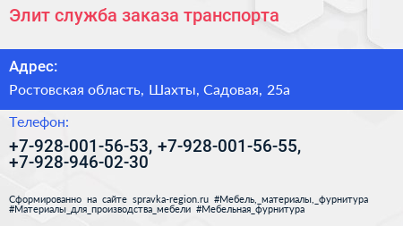 Элит, служба заказа транспорта по адресу Ростовская область, Шахты, Садовая, 25а в дальнейшем Организация, размещена в следующих категориях: